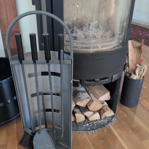 Spisverktyg i svart metall med flera verktyg för hantering av eld, inklusive skyffel, borste och tång. Passar för användning vid öppna spisar eller eldstäder.