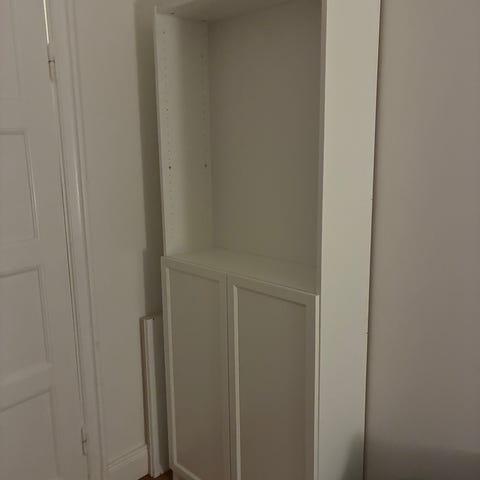Vita låga bokhyllor med vita Oxberg-luckor, 40x106, finns en.