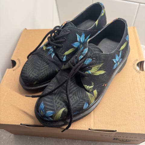 Dr. Martens Finskor i storlek 37 tillverkade i svart lackläder. Skorna har en klassisk design med snörning och gummisula med mönster för grepp.