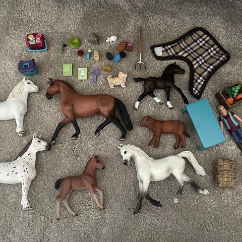 10 st Schleich-hästar, en ryttare, en hästskötare, 4 st täcken samt lite tillbehör. Perfekt julklapp!