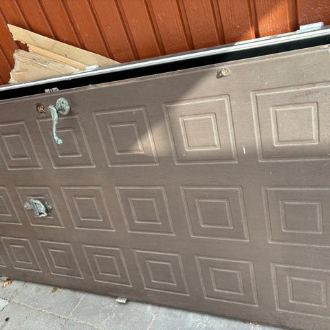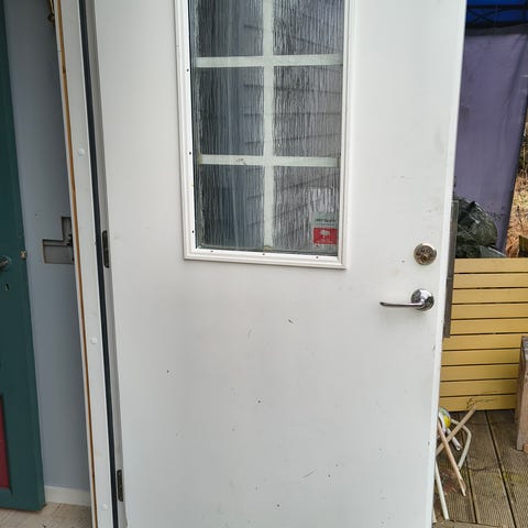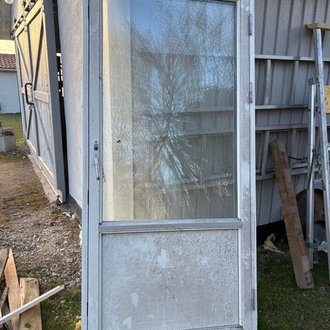 Ytterdörr i grå färg med glasruta med trä insida. Dörren är proffesionellt målad för ca 12 år sedan. Karmen ingår och nedmontering går att lösa.