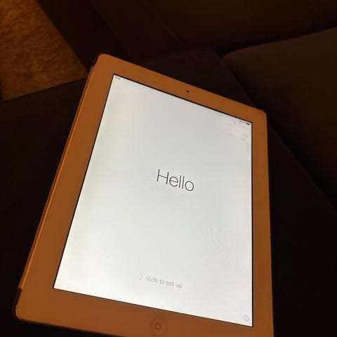 Apple iPad med 16 GB lagringsutrymme. En surfplatta med pekskärm och bakre kamera. Enheten har vissa synliga sprickor på skärmen.