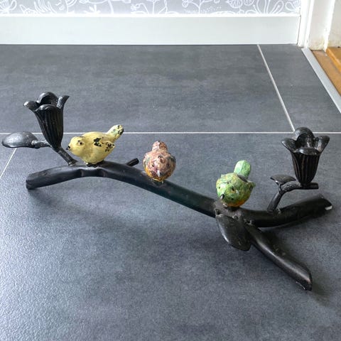 En dekorativ keramisk ljusstake formad som ett träd med blommor och blad. Höjden är cirka 20 cm.
