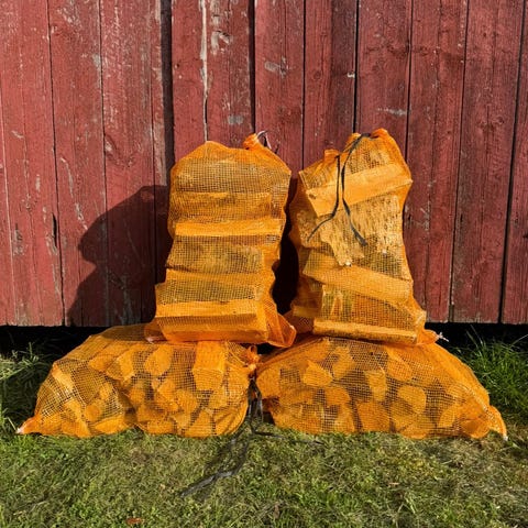 Björkved i 40L nätpåsar. Hugget 2024 (redo att eldas med). Kan levereras dock med ett extra pris.