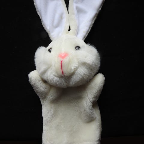 Mjukisdjur i form av en vit kanin med gyllene öron och ett gult hjärta på magen. Inkluderar en blå plastbehållare formad som ett ägg med två genomskinliga öron. Produkten är lämplig som leksak eller samlarobjekt.
