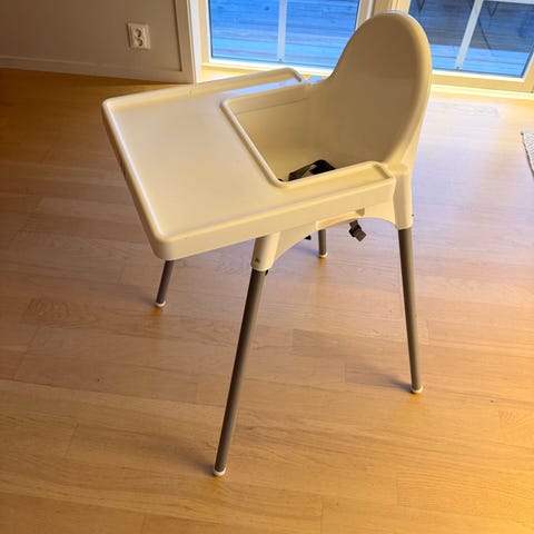 Ikea antilop matstol med bricka. Den behöver tvättas. Brickan har lossnat lite plast som jag fotade. Tror man kan dra bort det.