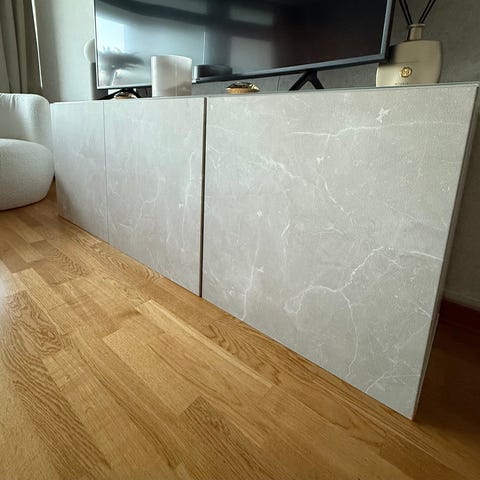 BESTÅTv-bänk med dörrar, vit Kallviken/Stubbarp/mörkgrå betongmönstrad, 120x42x74 cm