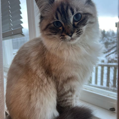 Vid köp kommer ni få alla hennes saker kattlådan,matt och vatten skålar, koppel, hår kam lite leksaker , matten och sand som kommer vara hos oss om du är intresserad berätta lite om dig själv och var du kan erbjuda för hem 🏠 🩷