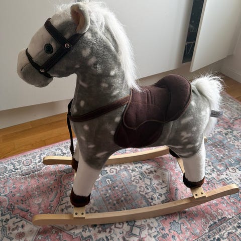 Leksakshäst i fint skick, fungerar bra för Barbie och liknande dockor. Hästen har rörliga ben, brun sadel och rosa träns samt töm. Perfekt för lek där dockorna kan rida eller sköta stallet. Inga skador och allt fungerar som det ska.