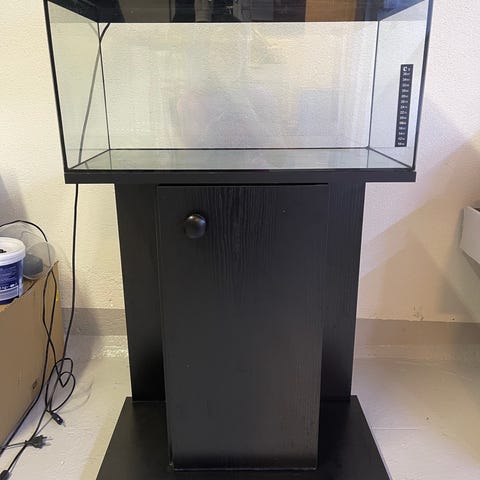 Akvarium med stativ i vit färg. Fyrkantig form med glasväggar. Den var gulbrun från början har målat själv.