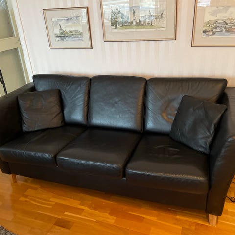 Skinnsoffa ( konstläder tror jag )skön att sitta i. Tveksam om det är en Mio soffa. Tror att det är en Mio modell men är inte säker på det. Den köptes ny av oss för 30 år sedan.