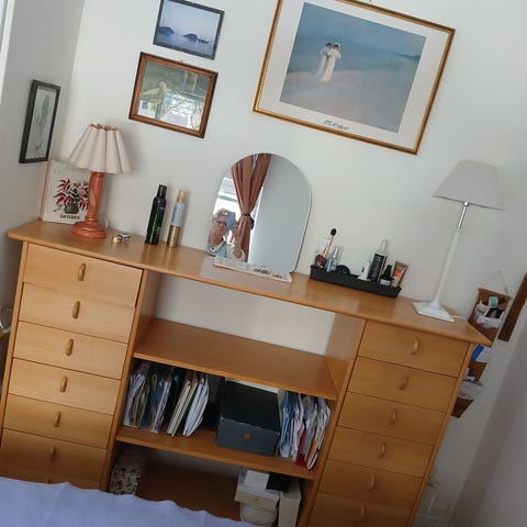 Ett fint sideboard med två glasskivor och en träskiva i mörkt/svart trä. Fint använt skick, några repor på ovansidan men om man har saker på (som vi haft) så tänker man inte på det. Kan skicka fler bilder!