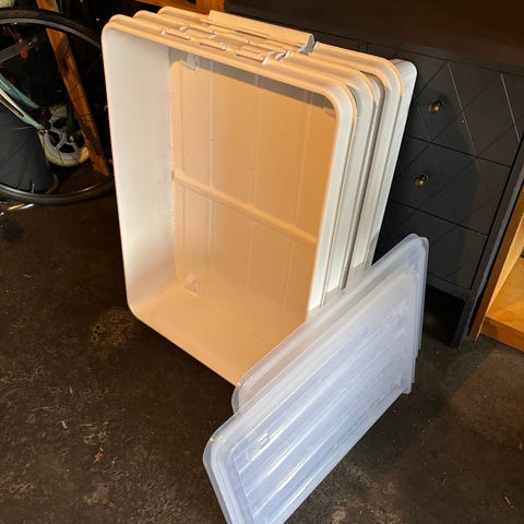 4 st förvaringslådor till IKEA dubbelsäng säljes. Framsidan är 29 cm hög men själva lådan 20,5 cm hög golvet.