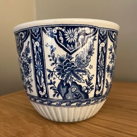 Handdekorerad i den ikoniska blåvita “Delft-blå” stilen med detaljrika blommotiv i floris-mönster.