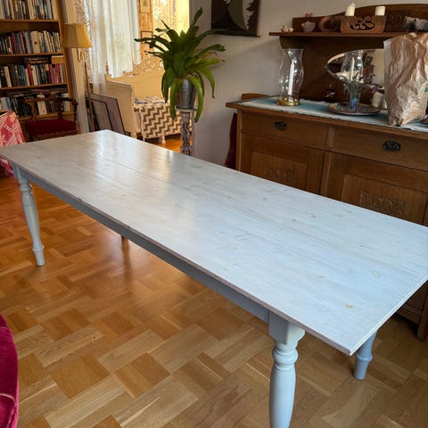 Matbord med ben i björk och vi bordsskiva. Lätt att torka av bordsskivan och man får plats många gäster!