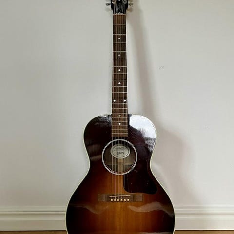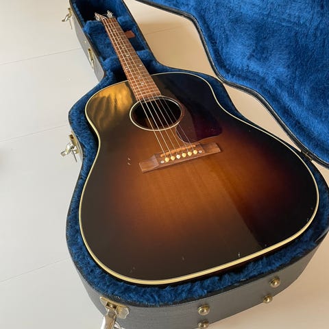 Inga sprickor och inget halsbrott utan i ett fint skick. Stallet bytt till ett med höjdjustering för lättare justering av stränghöjden. Sidor och botten i mahogny, solitt granlock Original ”Crocodile Chipboard Case”. Sextio år gammal vintage gitarr!