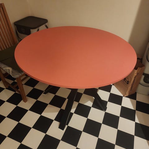 IKEA runt matbord med svart marmormönstrad bordsskiva och svarta ben. köksbord (Mariedamm), Har en diameter på 105 cm och en höjd på 73 cm. Designen inkluderar korslagda ben för stabilitet.