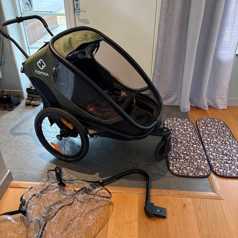 Cykelvagn från hamax. Den är sparsamt använd och i gott skick. Den har tyvärr blivit lite solblekt på ena sidan. Utöver det är den väldigt fin.