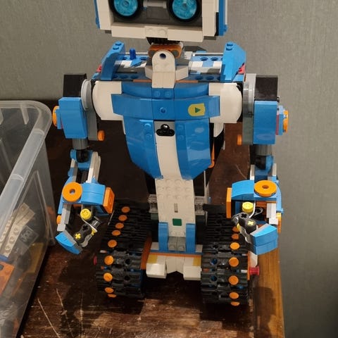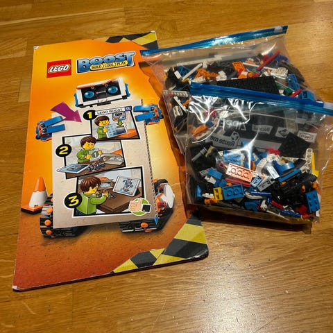 LEGO Mindstorms Boost robotbyggsatser med olika delar för att bygga och programmera robotar. Setet innehåller komponenter som robotarm, hjul, sensorer och koner, samt en manual och instruktioner för montering och programmering. Passar för barn i åldern 7-12 år.