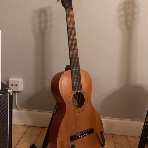 Akustisk balalajka med traditionell design och träfinish. Instrumentet har tre strängar och används främst i rysk folkmusik.