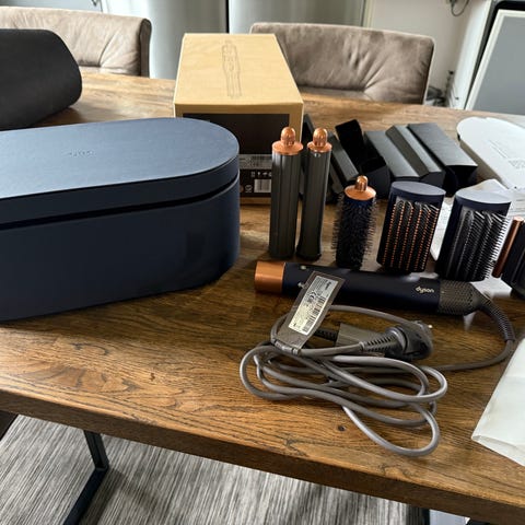 Dyson Airwrap Complete hårstylingverktyg i bronze/rose färg. Inkluderar flera stylingtillbehör för olika hårlängder och stilar. Används för att skapa volym, lockar och slät styling med hjälp av luftflöde och värme.