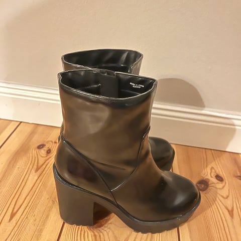 Monki klackskor i storlek 36 med brun mönstrad yta och svart elastisk rem över foten. Skorna har en unik design med rundad tå och är tillverkade för dam.