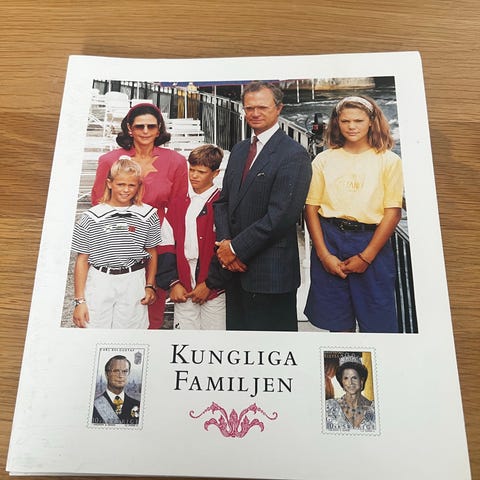 Kung Carl XVI Gustaf 40 år och 10 frimärken som trycktes upp till hans 40-årsdag och bilder och text från o med Kungens födelse 1946 tom 1984