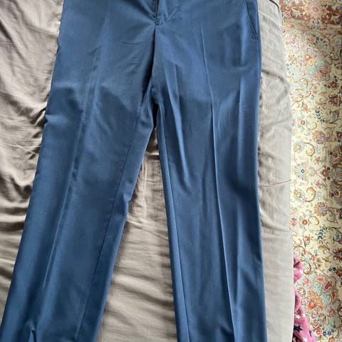 Detaljer: sidfickor fram, två bakfickor med knapp, hällor för skärp