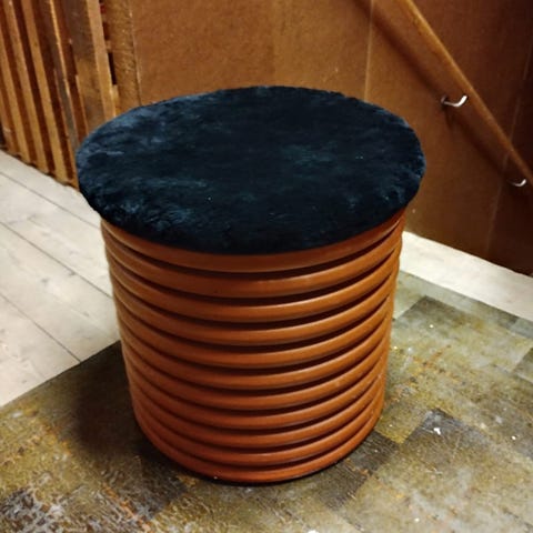 Träpall med rund sits och skruvjustering för höjd. Tillverkad i trä med en stabil trebent bas. Passar för olika användningsområden där justerbar sittplats behövs.