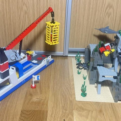 LEGO ocean Explorer byggsats med detaljerad design inklusive kran och olika tillbehör. Byggsatsen är avsedd för konstruktion och lek, med fokus på fartygsmodellering.
