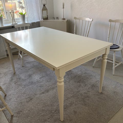 Ingatorp 4-sits matbord som enkelt kan förlängas till 6-sits med iläggsskivan som förvaras under bordsskivan. Väl omhändertaget.
