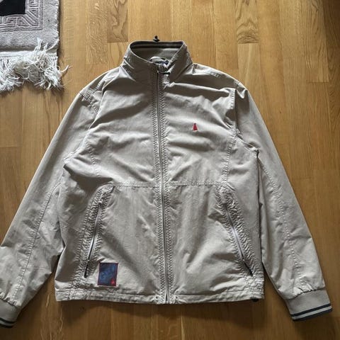 Mel Richman jacka i blå färg, herrstorlek L. Jackan har en klassisk design med dragkedja och knappar framtill samt en märkeslogotyp på ärmen. Insidan är röd med detaljer i vitt och blått.