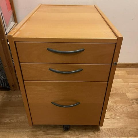 två rullbara hurtsar i ljust träfaner med trähandtag och lås.