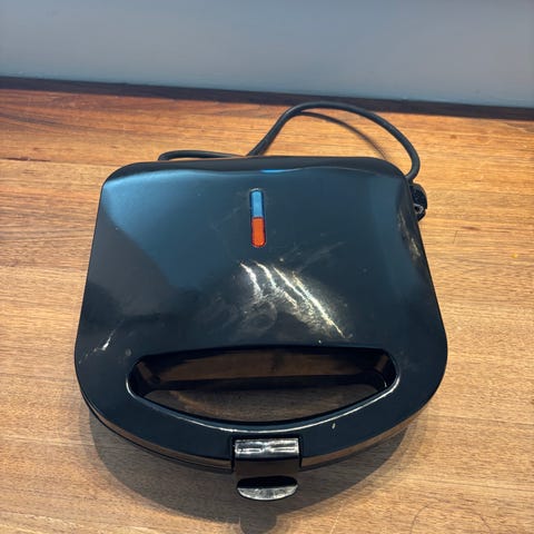 Säljer en elektrisk hamburgergrill i fint skick. Perfekt för att snabbt grilla två hamburgare samtidigt hemma.