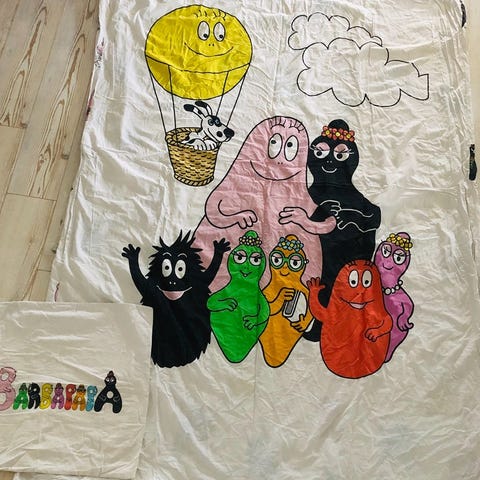 Sparsamt använda sängkläder med Marcus och Martinus-tryck.