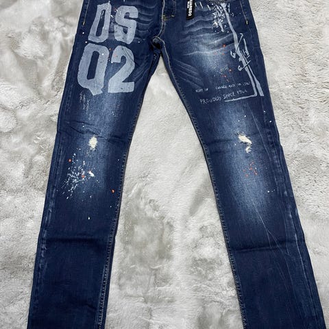 Denimjeans i blå färg, storlek W50 och herrstorlek M. Tillverkade i denimmaterial med detaljer som slitningar och färgstänk hämtas på plats