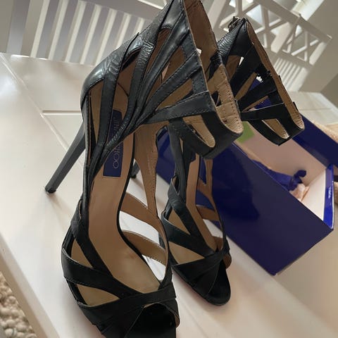 Oanvända klackskor i storlek 38, tillverkade i svart mocka. Skorna har en öppen tå och ankelrem med knytning. Passar för formella och festliga tillfällen.
