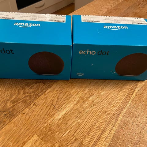 Amazon Echo Dot smart högtalare i svart färg. En kompakt enhet med kontrollknappar för volym och mikrofon. Produkten levereras med en vit strömadapter och kabel för anslutning.