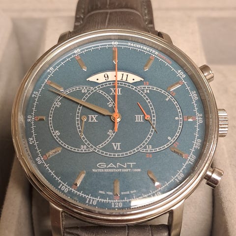 GANT herrklocka med svart urtavla och brunt läderarmband. Klockan har en rund boett och visar tid samt datum. Läderarmbandet har justerbara hål för anpassning. Nytt batteri behövs
