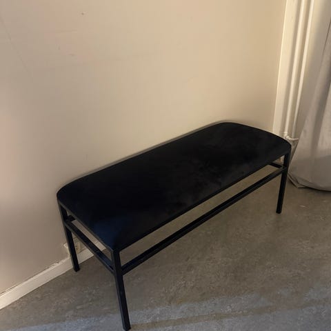 Säljer en elegant grå bänk i sammet med dekorativa knappar och svarta ben. Mycket fint skick. Perfekt i hallen, sovrummet eller vid fotänden av sängen.