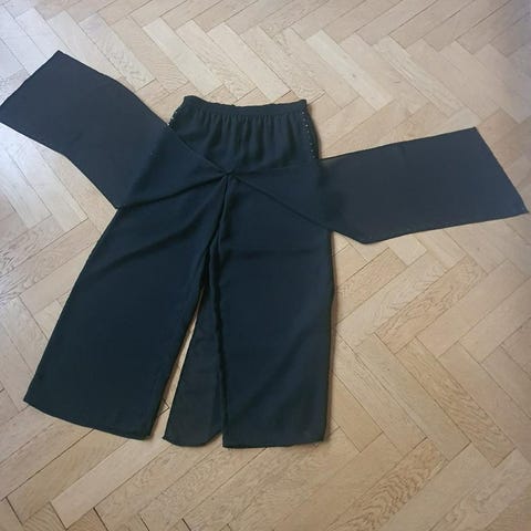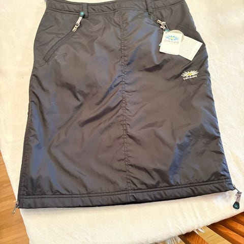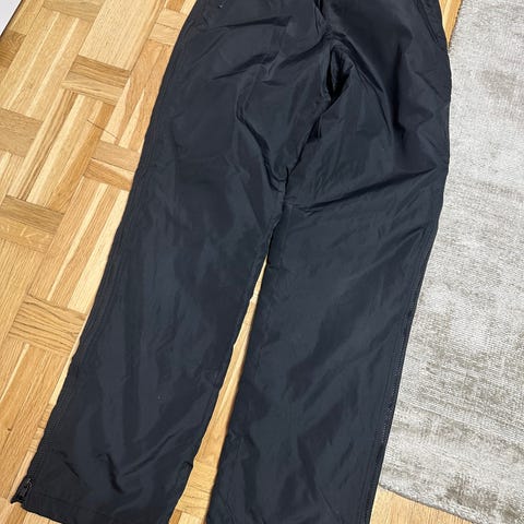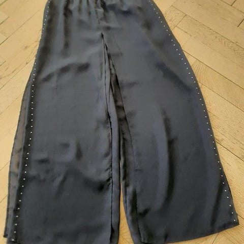 Blixtlås i hela ena sidan. Två fickor med blixtlås. Resår i midjan samt hällor för skärp. Sprund nertill i varje sida med dubbelt blixtlås som går ända upp.