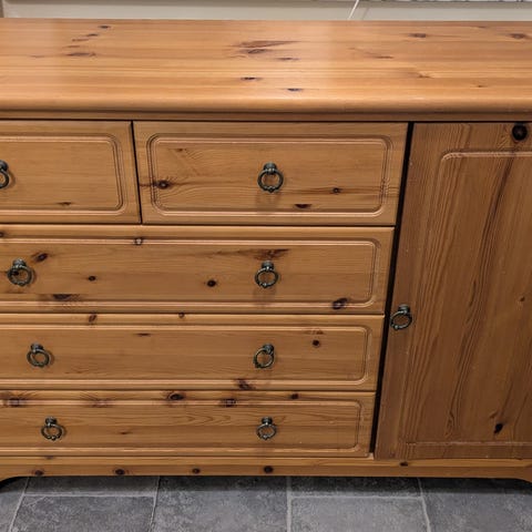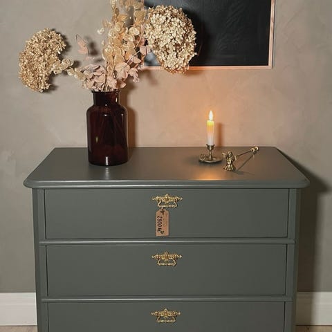Byrån har tre lådor med metallringar som handtag.