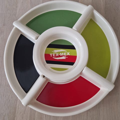 Servis bestående av en stor tallrik med flera fack, fyra mindre tallrikar och två skålar med skedar. Servisen är gul i färgen och tillverkad i porslin. Passar för servering och förvaring av mat.