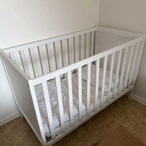 Säljes med tillbehör, madrass, madrasskydd, spjälskydd, täcke och kudde.