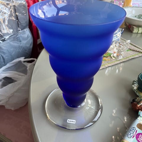 Kosta Boda , troligen Vicke Lindstrand, glas med blå fot och grön kupa. Tillverkat av glasmaterial. Passar för dekorativa ändamål. (Ingen kosta märke kvar)