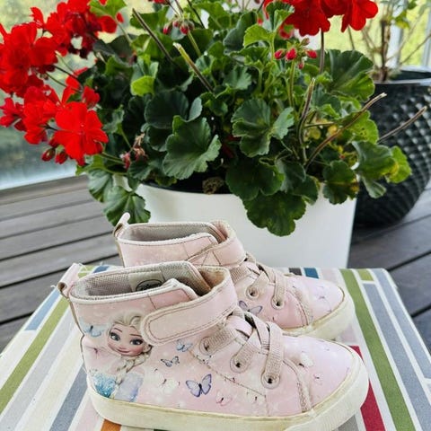 Skorna har kardborreband och är designade med hjärtformade detaljer. Sulorna har mönster för grepp. Material och färg framgår av bilderna.