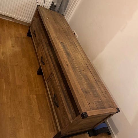 TV-bänk i trä med hyllor för förvaring av elektronisk utrustning eller andra föremål. Designen inkluderar öppna fack och ett skåp med dörr för organiserad förvaring.