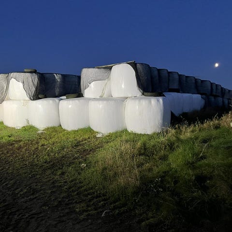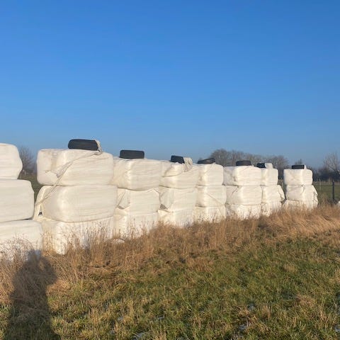 Skördat i juni 2025. Vikt ca 45-50 kg. 10 lager plast. Analys finns, 77 % ts, värden per kg foder: 5,8 MJ, 18 g smb rp, 88,49 g totalt socker WSC.