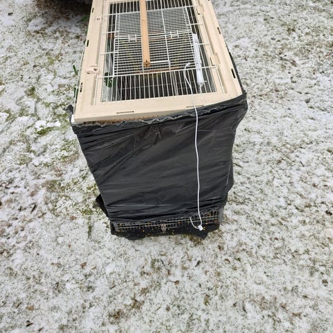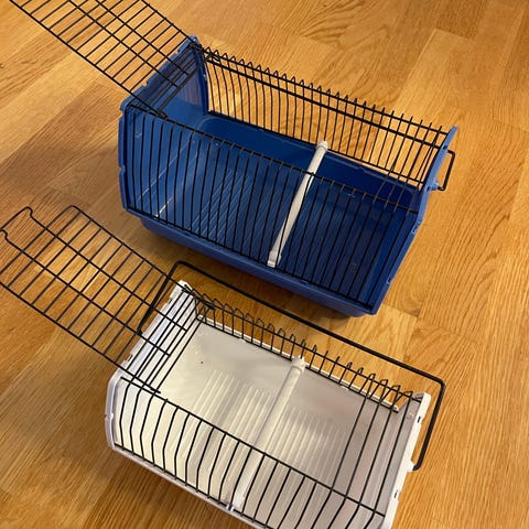 Bur för småfåglar med svart botten och vit gallerkonstruktion. Inkluderar flera tillbehör som sittpinnar, mat- och vattenbehållare samt leksaker. Undulatfröblandning och sand.