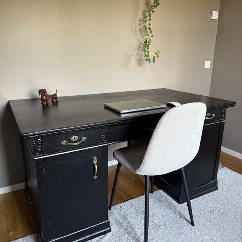 Unikt skrivbord/bord i massiv ek med nåtade tjocka plank. Enligt förra ägarens utsago är det byggt av en sjöman i England, har haft det i min ägo i ca 15år. Ett otroligt bastant och rejält skrivbord som passar bra för att jobba och skriva vid!